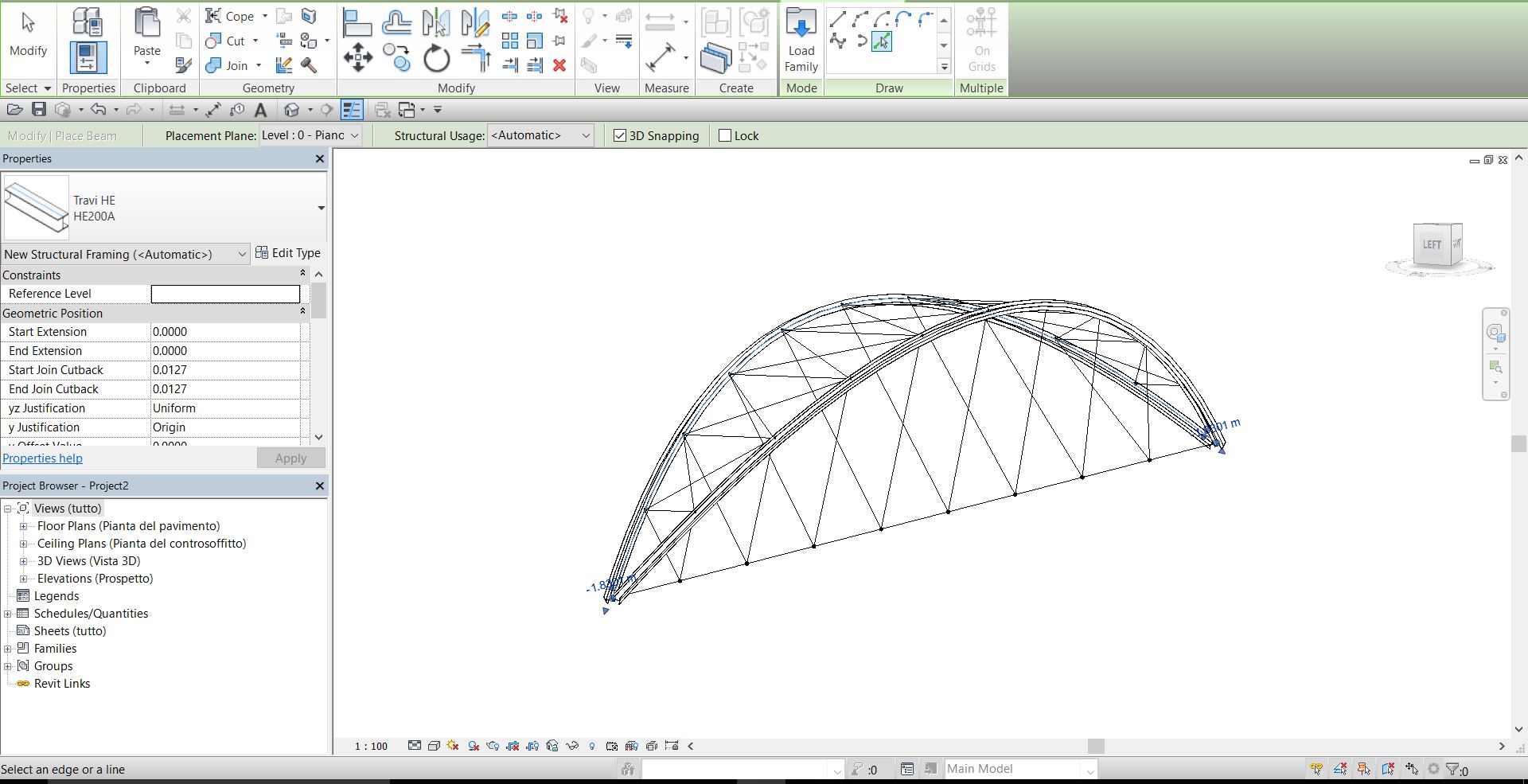 Il primo metodo, (tra tutti il più intuitivo) consiste nel cominciare la modellazione da una famiglia di massa, e disegnare le linee 3D degli assi strutturali opportunamente parametrizzate. In questo modo verranno mantenuti e riconosciuti i nodi strutturali.